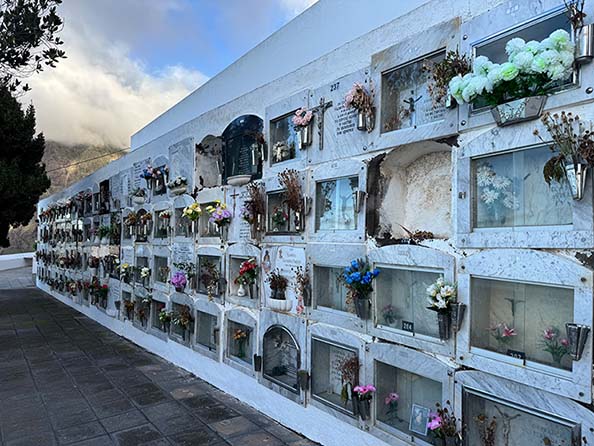 Während die meisten der Gruppe jetzt bei einer kleinen Weinprobe sind, sind wir zu der kleinen Kirche (?) im Ort hochgelaufen und haben anschließend auf der anderen Seite der Straße noch einen Abstecher oben zum Friedhof gemacht. Das arme Ömchen, was das Öpchen mal besuchen will – Himmel, ist die Straße steil…