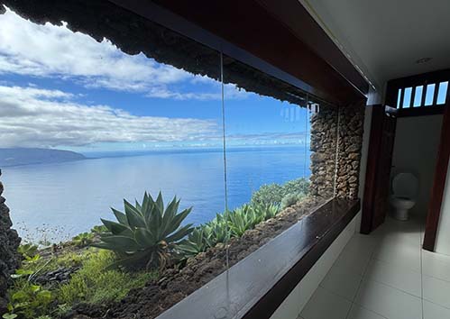 Im Restaurant war für unsere Gruppe eine lange Tafel in weiß eingedeckt. Der ganze Bereich hat eine komplette Glas-Seite, so dass man einen gigantischen Ausblick unten auf das Meer und den Bereich hat, den wir gestern gewandert sind.